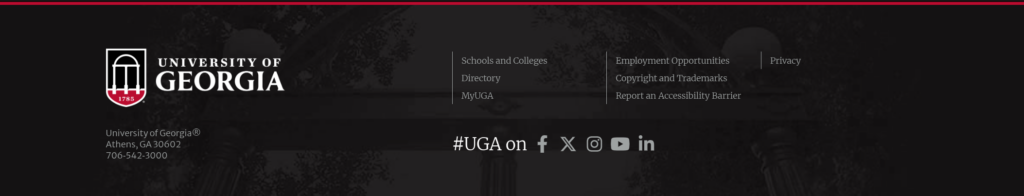 The global web footer provides visual consistency across all UGA websites. Users can easily navigate to key university-level pages from all UGA websites. The footer includes several required links to help maintain consistency but is also flexible to accommodate specific website goals. Similar to the header, the footer can be appended after any existing site-specific footer on your website.